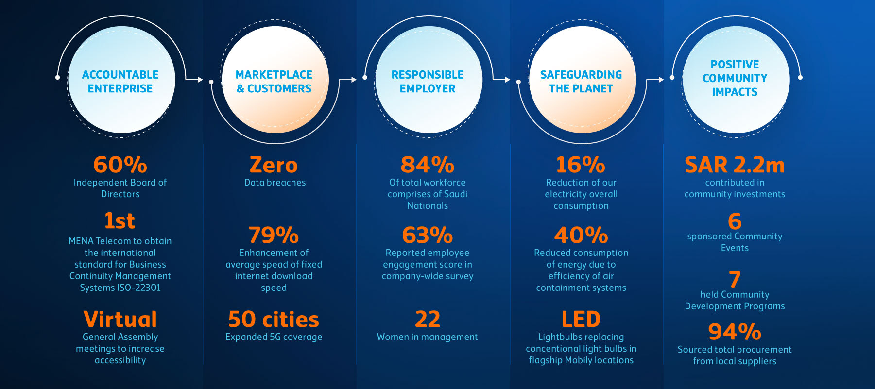 في عام 2020 ومع بداية تفشي الجائحة، كان تركيز شركة موبايلي ينصب على الحفاظ على صحة الموظفين ورفاهيتهم مع الحفاظ على مسيرتنا في النمو، ونتيجة للإستجابة السريعة والفعالة لتلك الأزمة، تمكنّا من ضمان استعدادنا على جبهات متعددة، كما نجحنا في بناء مرونة موبايلي على مدار العام، وعلى الرغم من العمل في ظل بيئة صعبة، كان عام 2020 عامًا حافلًا بالإنجازات التي عزّزت من قدراتنا على تحقيق رؤيتنا من خلال القيادة والابتكار المستمر في خدمات الاتصالات، كما نسعى جاهدين للعمل بمسؤولية، والتأثير بشكل إيجابي على المجتمع الذي نعمل فيه، مع الحفاظ على النجاح المستدام.