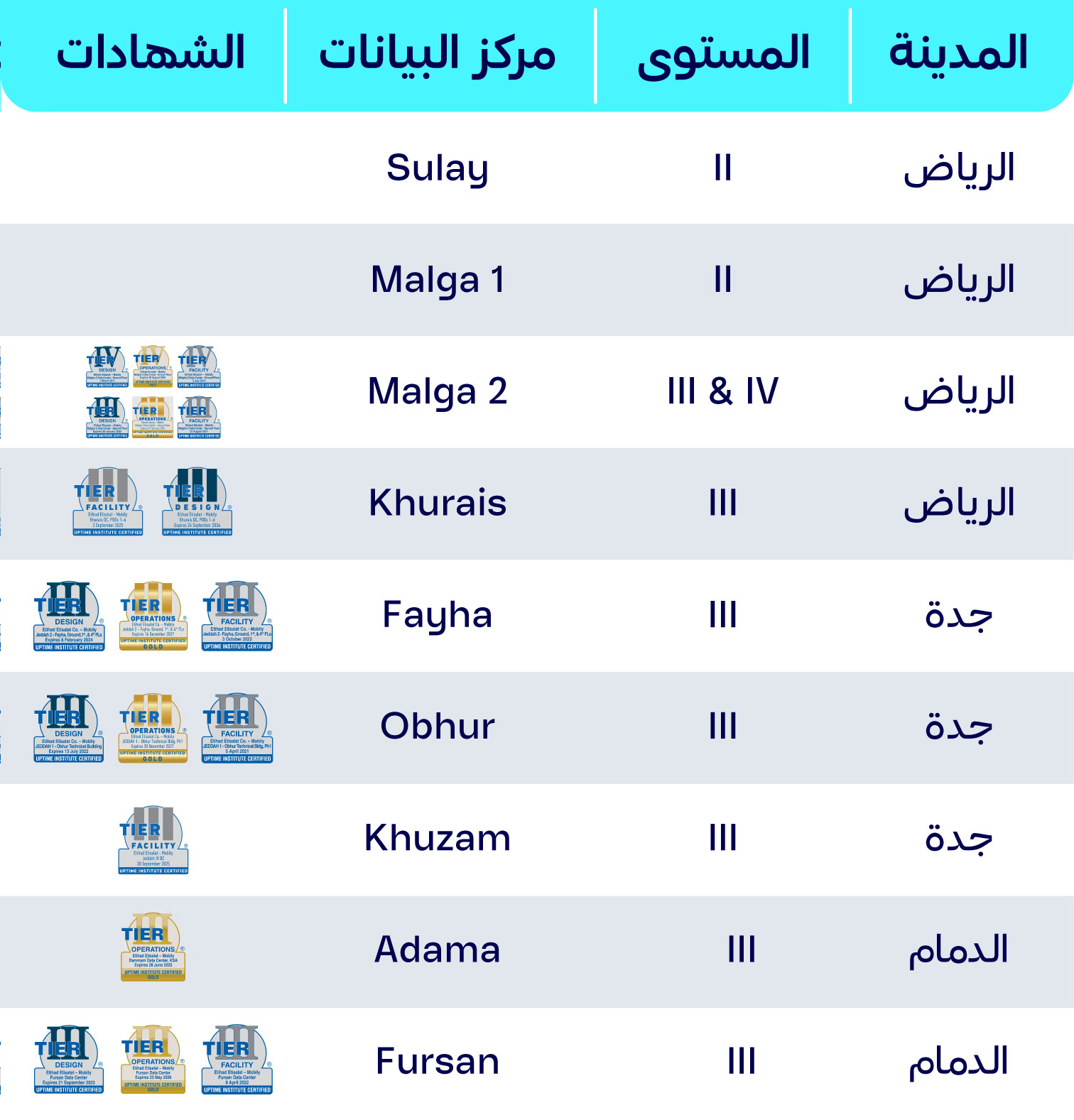 حاصلة على شهادات Uptime Institute بدرجات II وIII وIV، بالإضافة إلى شهادة ISO 27001 لضمان أعلى المعايير العالمية.